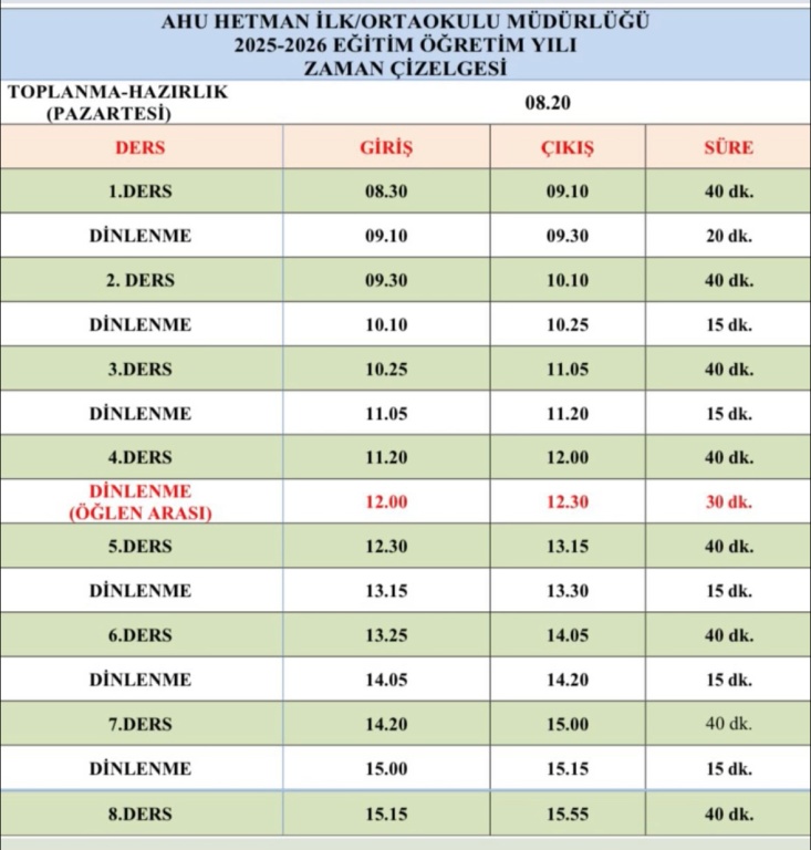2025-2026 EĞİTİM-ÖĞRETİM YILI ZAMAN ÇİZELGESİ